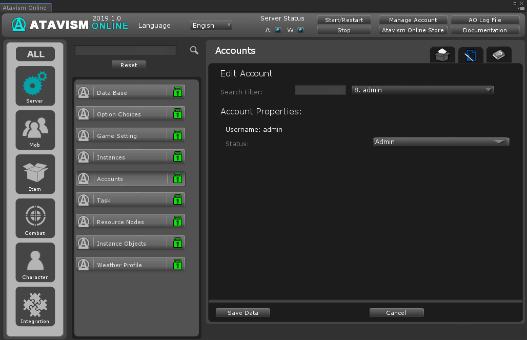 Control accounts created on your server. You cannot currently create an account from this plugin, the account must be registered through the login when the game starts, or you must add them indirectly through the database. Once an account has been created and it has logged into the game once it will appear in the Editing section of accounts from where you can set what Access the account has from normal, banned, GM or Admin.