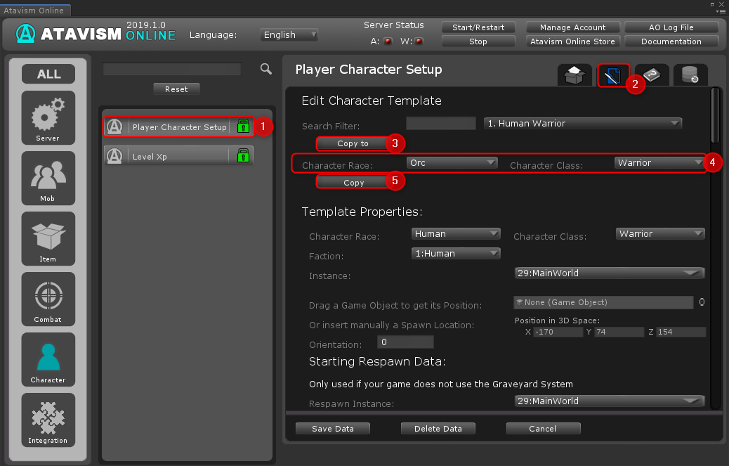 Then in Atavism Eidot open Player Character Setup -> Switch to Edit Tab -> Select the first setup like Human Warrior -> Click Copy To button -> Select Orc as a race and Warrior as a Character Class, and click the Copy button. Repeat this step for Mage and Rouge or any other classes you want to add for the Orc Race.