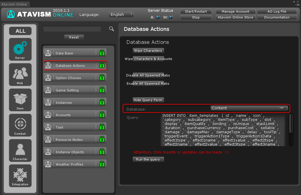 Open Atavism Editor -> Database Actions, and click Show Query form button. Then Select Content from the Database dropdown list, paste query which you can find below, click Run the query and confirm.