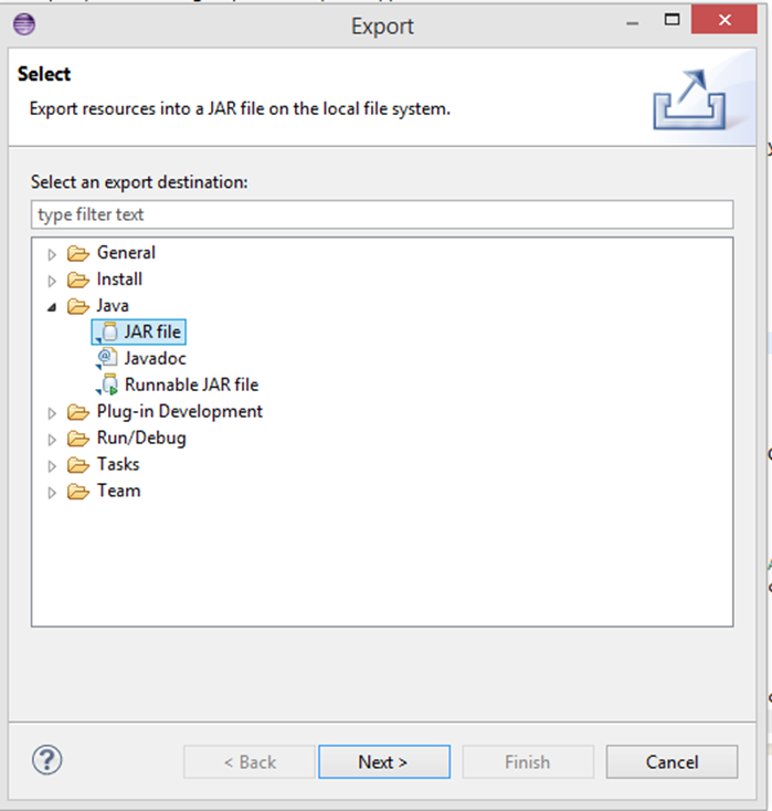 From the Export, the window expands the Java folder option and choose JAR file. Click Next.