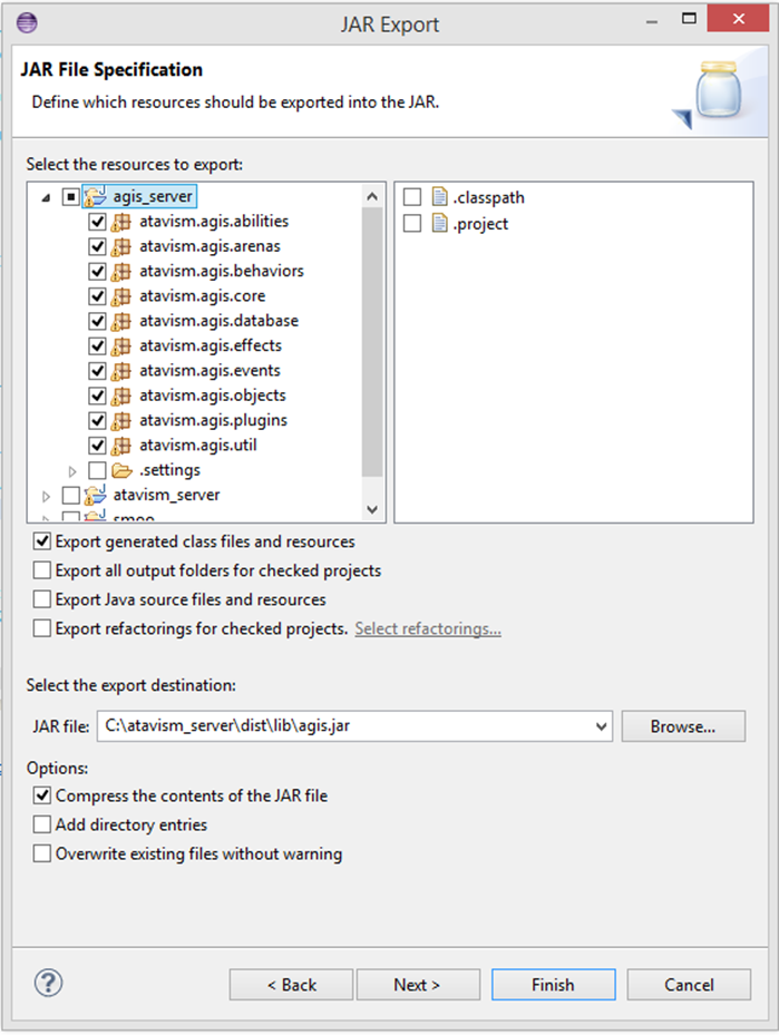 Set the export destination (make sure the file is called agis.jar) and click Finish.