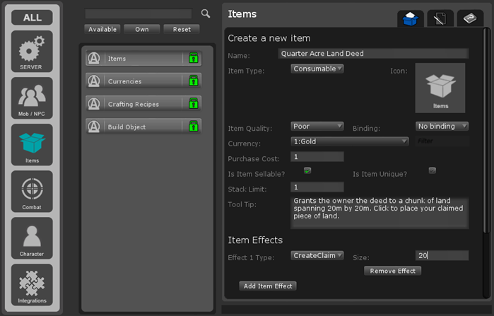 - Items with a ‘CreateClaim‘ effect can be used. Make sure the size field is filled in. It is in meters.