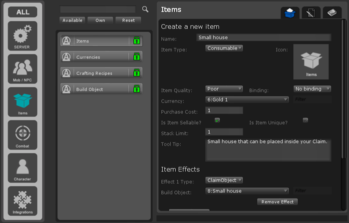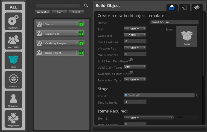 - Items Required allows you to set up to 6 different materials required to construct this build object.