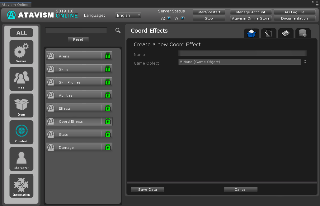 1) In the Atavism, Editor click on the Coord Effects plugin. Write in a name for your coordinated effect (it doesn’t have to match your prefab name) then drag your Prefab into the Game Object slot and click Save.