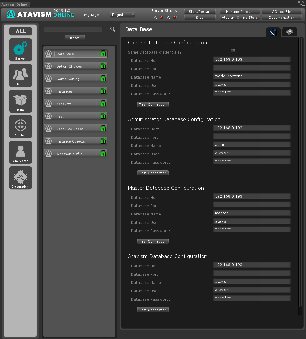 Before you can access and save data to the database the connection settings need to be set up. To set your database connection settings click on the Data Base button at the top of the Plugin List in ALL or SERVER tab.