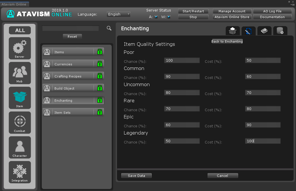 Item Quality Settings: Defines chance per item quality as well as cost percentage per item quality.