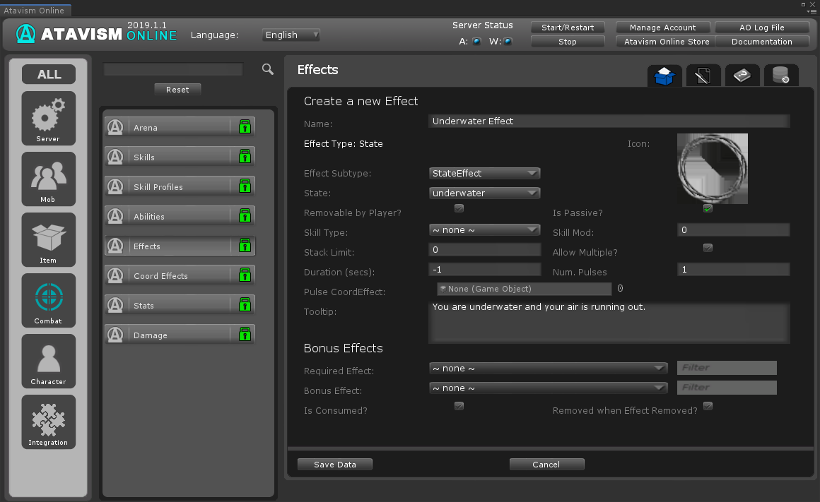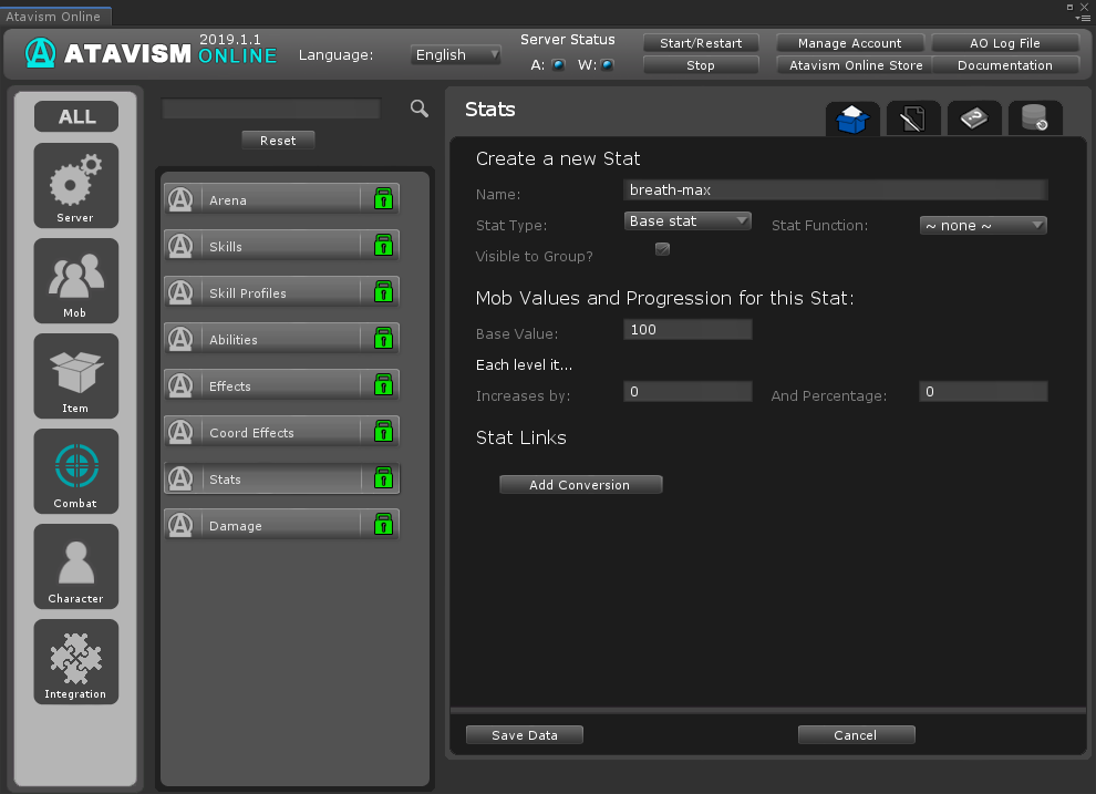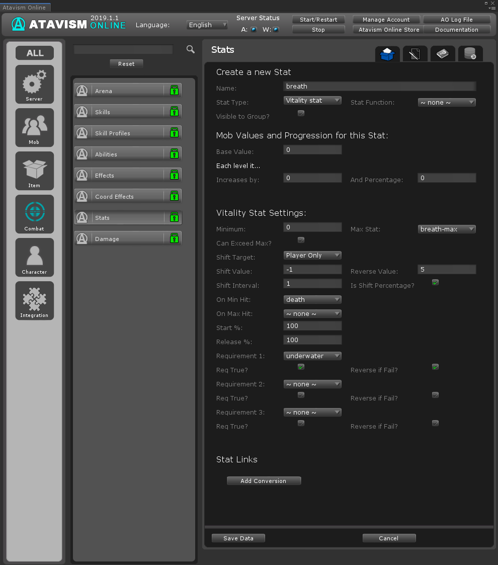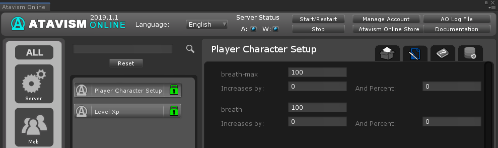 - Configure the breath and breath-max statistics in the player character template plugin in the Atavism Editor, set it to 100, save and restart Atavism world server.