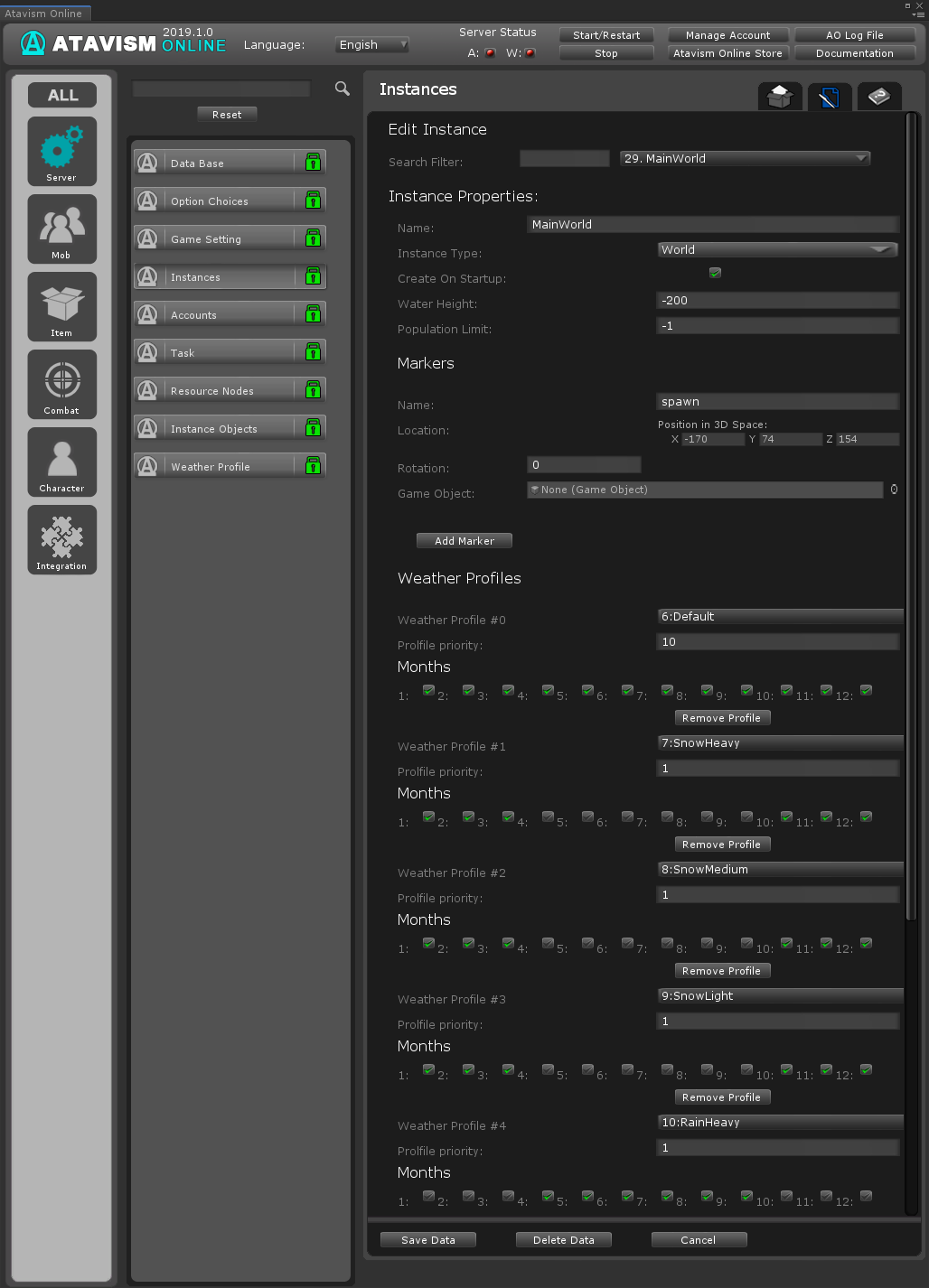 This is where you set up your instances. By default, MainWorld instance is already set up. If you have more instances (Unity Scenes) to setup you will do it here. One thing to make sure is that you add the scene to the Unity Build Settings or Atavism won’t find that instance when it’s running.