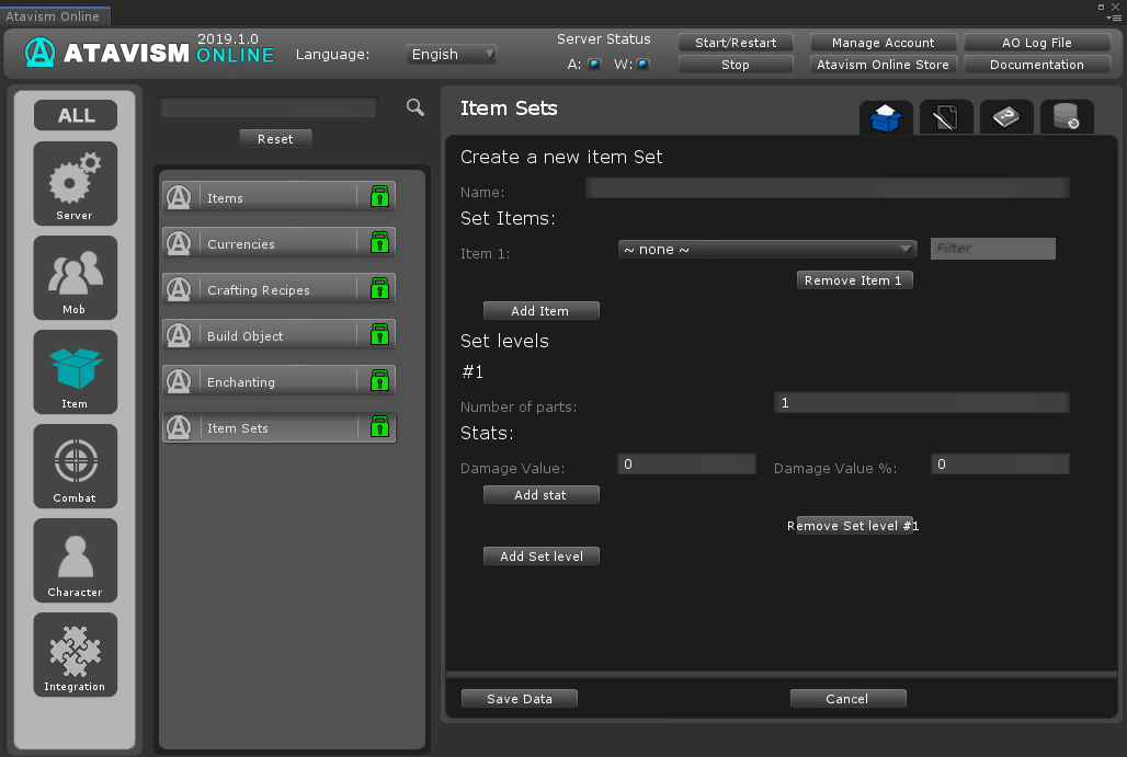 Item Sets Plugin lets you define sets in Atavism, and you can configure them by such parameters: