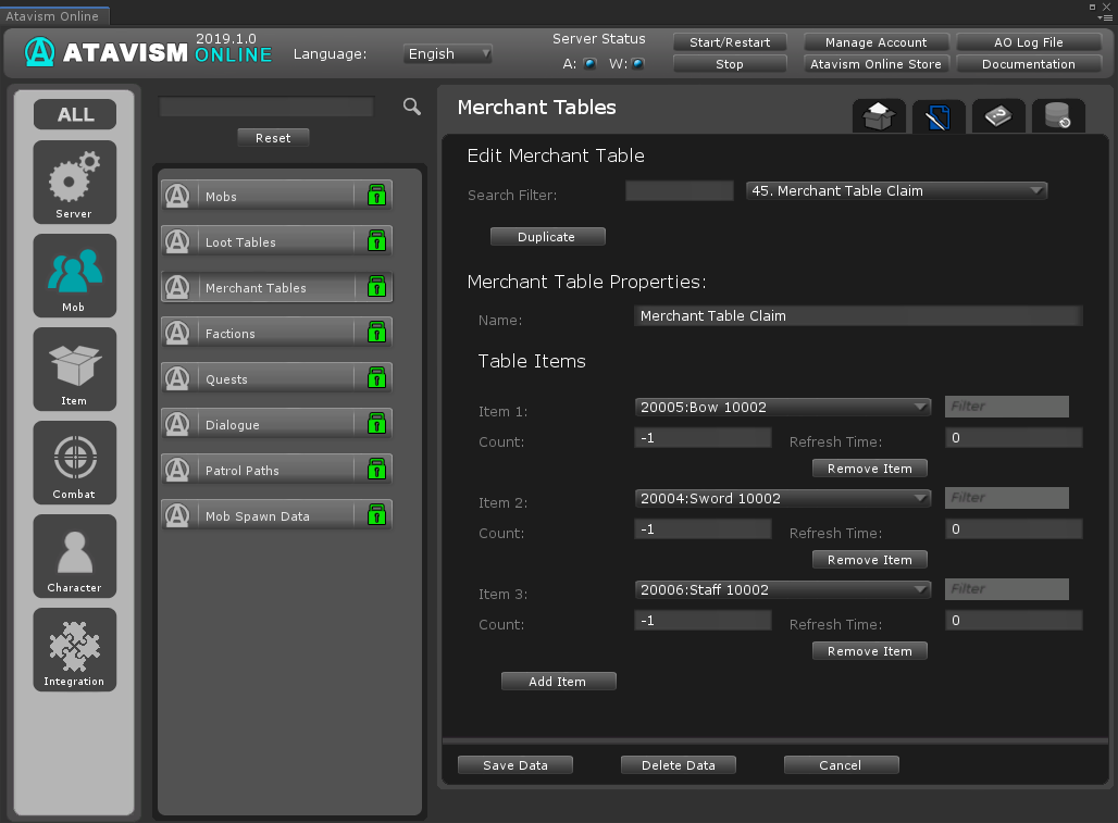 Merchant table can be attached to Mob/NPC which should trade with a player. It can be done by using in-game spawner. Detail information can be found in Mobs Plugin Configuration section.