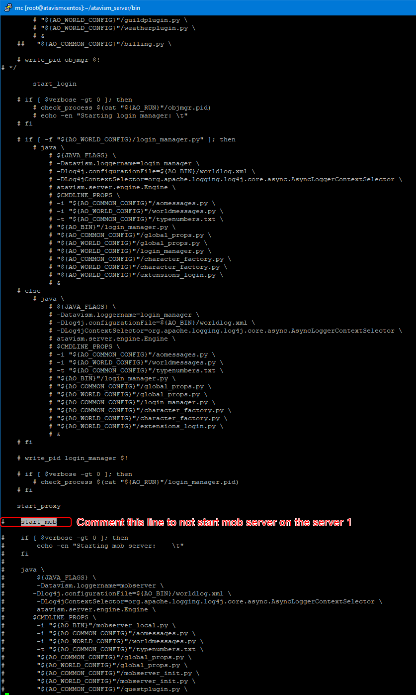 In the world.sh on this server 1, you should comment the line related to the mob server startup, as we want to start it on server 2 but not on server 1.
