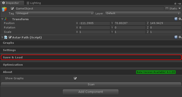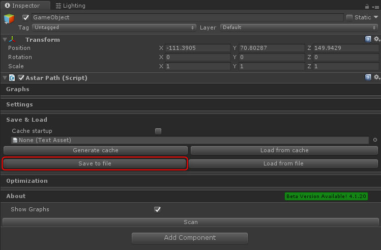 - Select directory where you want to save it. The most important part is that name of the file must be corresponding to the Atavism instance name, for example, if you are preparing NavMesh Graph for MainWorld Instance then the file should be named as MainWorld.bytes. and click save