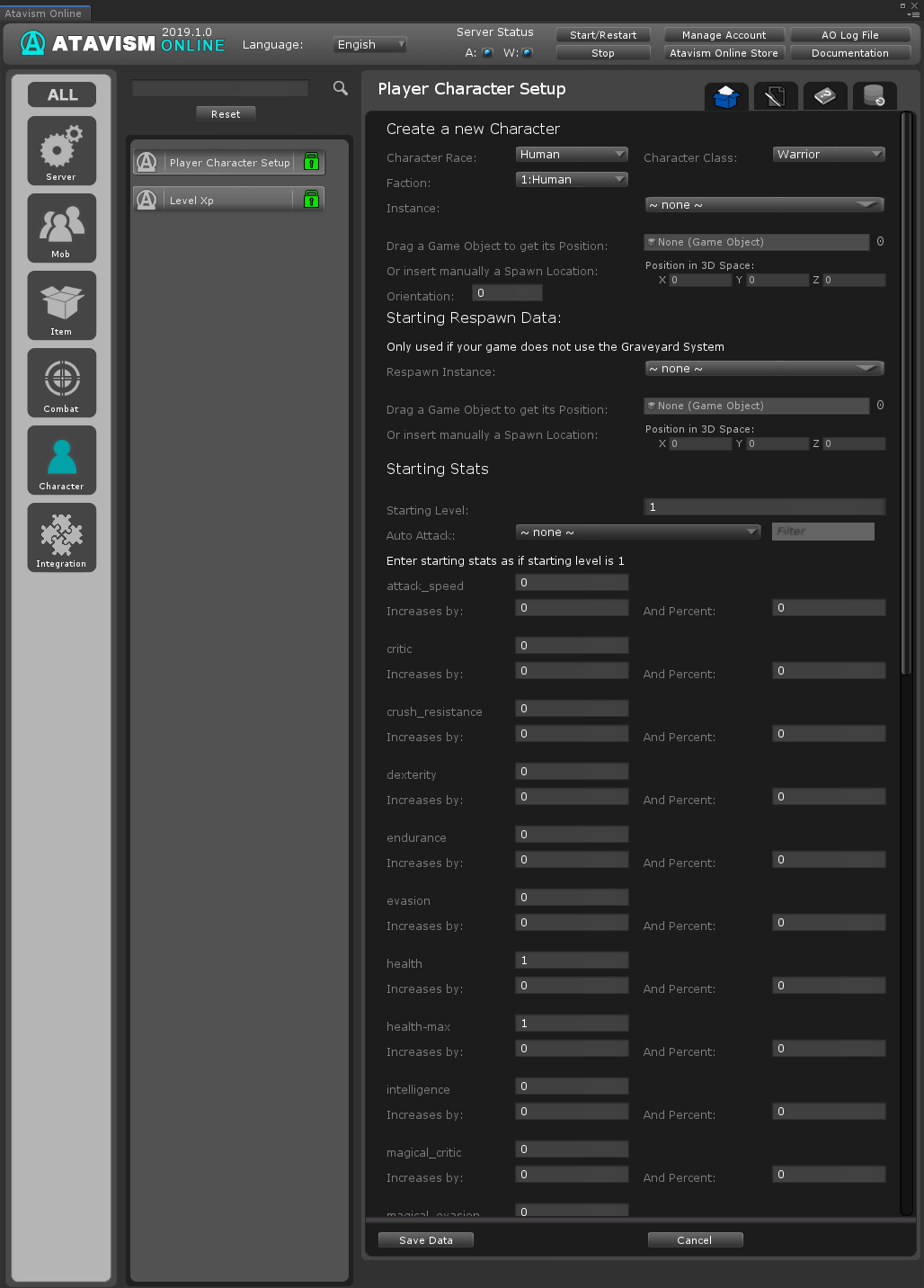 The starting value of stats and how they increase as a player levels up can be set for each Race/Class template. It follows the format of starting stat value, how much the value changes each level (as a number) and then how much in percentage it changes. The formula is: