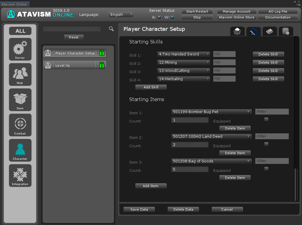 The last thing that can be set for starting characters is the items they have. Just like Skills, there is no limit to the number of items that can be given to a starting character (but take care not to fill their bags too much). The amount of an item can be set (count) and whether or not it is equipped on the character.