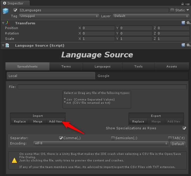 In case you would want a more advanced configuration like google spreadsheets, please read the authors documentation page: http://inter-illusion.com/assets/I2LocalizationManual/Features.html
