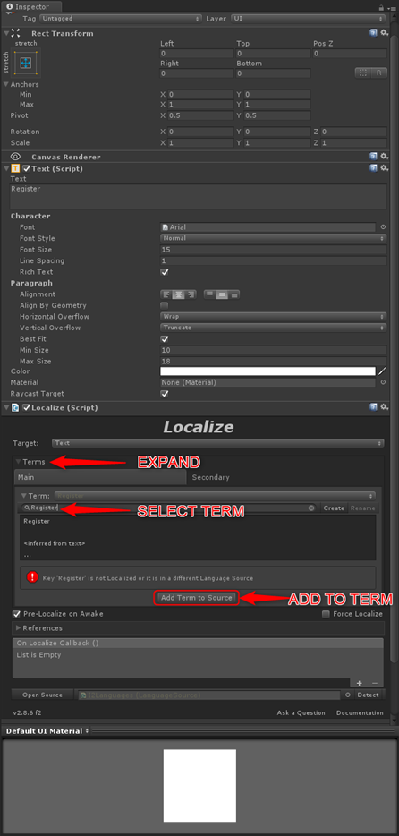 Then for each Canvas Text element you should add I2 localize component and if the key already exists in your terms list then you can pick that key from the list (it should be selected automatically based on Text Component Value) or you can search it by expanding Terms and putting name of the term in the input field.