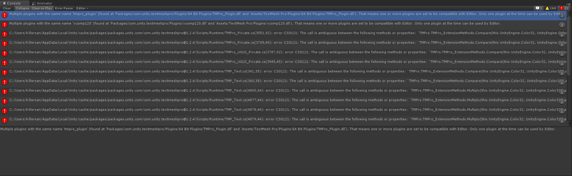 The most common issue on the client side, within Unity, is related to TextMesh Pro. If you have lots of TMP issues in the console like on the screen below, then you probably didn’t remove the TMP from your package manager. Check if you have followed this documentation point 1.