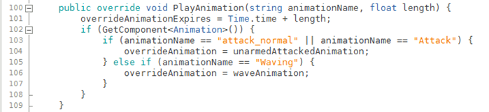 if (animationName == "attack_normal" || animationName == "Attack") { overrideAnimation = unarmedAttackedAnimation; }
