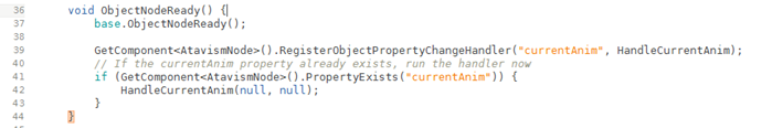 GetComponent<AtavismNode>().RegisterObjectPropertyChangeHandler("currentAnim", HandleCurrentAnim); // If the currentAnim property already exists, run the handler now if (GetComponent<AtavismNode>().PropertyExists("currentAnim")) { HandleCurrentAnim(null, null); }