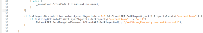 if (isPlayer && controller.velocity.sqrMagnitude > 0.1 && ClientAPI.GetPlayerObject().PropertyExists("currentAnim")) { if ((string)ClientAPI.GetPlayerObject().GetProperty("currentAnim") != "null") NetworkAPI.SendTargetedCommand (ClientAPI.GetPlayerOid(), "/setStringProperty currentAnim null"); }