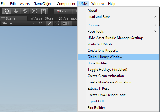 3. In Unity Editor from top menu open: UMA -> Global Library Window. For Atavism 2019.1.2+ this step is obsolete.