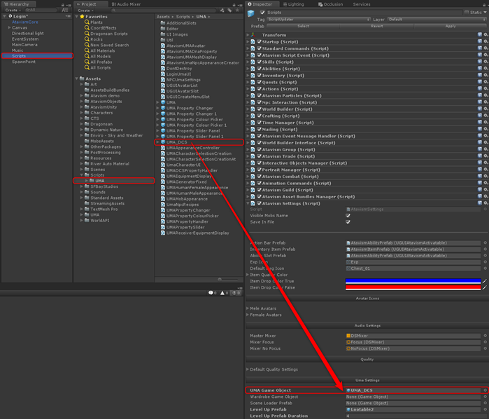 5. Open Login scene and find Scripts object, then drag UMA_DCS prefab from Assets/Scripts/UMA to AtavismSettings component into UMA Game Object variable.