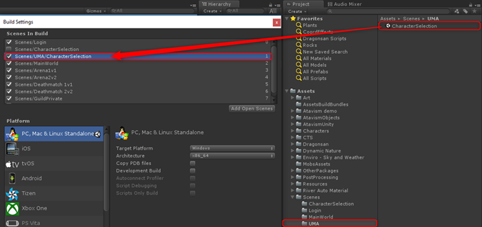 6. In the player build section replace previously added CharacterSelection scene with the one from Assets/Scenes/UMA/CharacterSelection