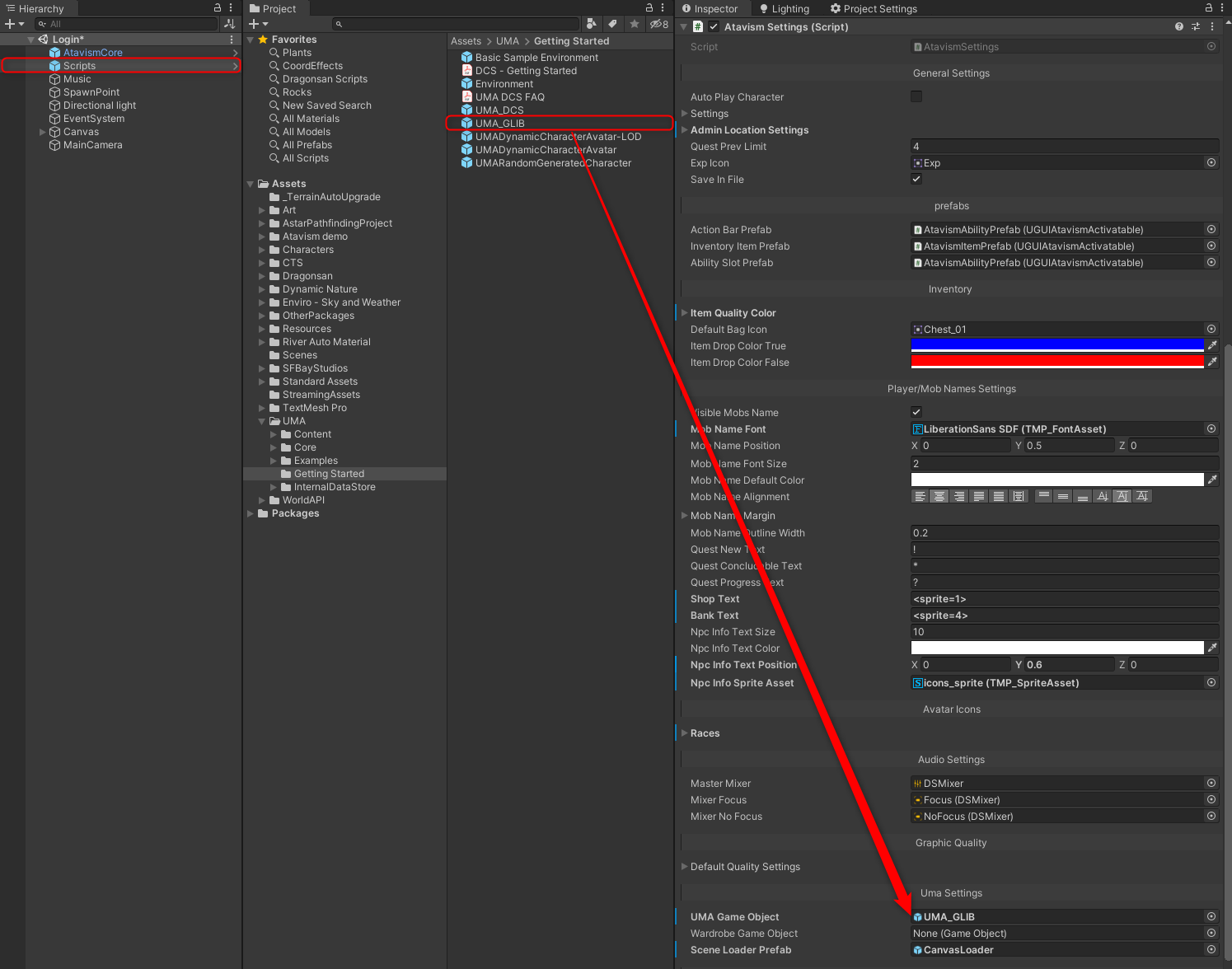 3. Open Login scene and find Scripts object, then drag UMA_GLIB prefab from Assets/Scripts/UMA to AtavismSettings component into UMA Game Object variable.