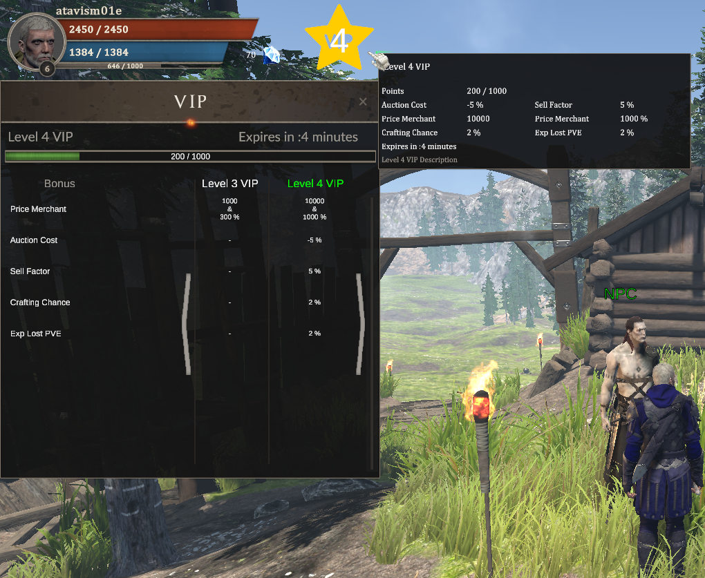 Bonuses for eavch level will be presented in the tooltip on the VIP icon along with level, and expiration time. Also when you will click it, available VIP levels witll be presented in the UI panel to compare them with other levels.