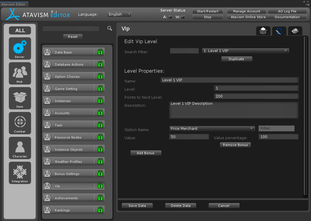 In this plugin you can define tiers/levels, VIP points, and bonuses per level. Points can be acquired by getting items with the VIP points effect (will give the defined amount of points). You can also define items with a VIP time effect, which will extend VIP time by the defined number of minutes. You can define an unlimited number of VIP levels.