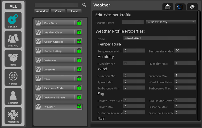 Generic selectors Exact matches only Exact matches only Search in title Search in title Search in content Search in content Search in excerpt Search in posts Search in posts Search in pages Search in pages Search in project Search in project Atavism Wiki > Plugins > Server Plugins > 天气插件 MENUMENU如何开始AtavismServer InstallationAtavism客户端(Unity)安装Plugins Server Plugins 天气插件 Mob/NPC PluginsItems PluginsCombat PluginsCharacter PluginsIntegration Plugins Setting up World Use Cases 人物模型,种族和职业饥饿,温暖和任何其他生存属性物品 – 药水物品-UMA武器物品-UMA装甲怪物互动物件手工艺任务领土和建筑物天气概况 高级编辑 多服务器配置Server scripts - AGISClient scriptsAGIS API Atavism 2018.2 Atavism 2018.2 UMA集成设置后处理堆栈2设置I2本地化(多语言)Master Audio AAA音频设置NavMesh寻路设置Enviro天气系统 天气插件 您可以在此处创建天气配置文件并指定参数。最常用的参数是雨雪。 在配置文件创建后,可以在Instance Plugin中的特定实例中调整rest。