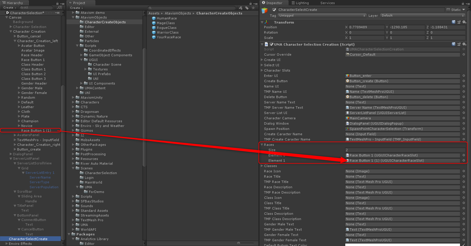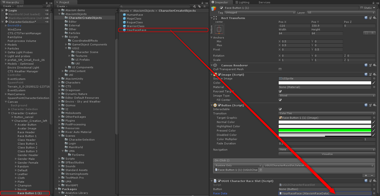 选择新创建的Race Button 1(1)并将Assets / AtavismObjects / CharacterCreateObjects / YourRaceRace预制件拖动到Race Data中,如下面的屏幕所示