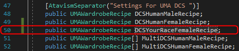 在Assets / UMA / Content / UMA_Core / HumanFemale / RaceData目录中复制Human Female DCS,并将其名称更改为YourRace Female DCS。