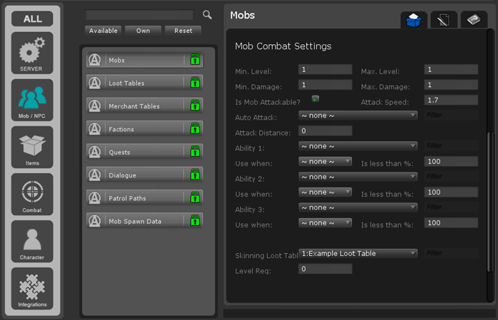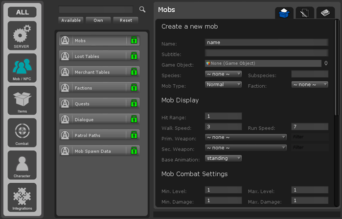 单击左窗格中的Mob / NPC按钮,然后单击第二个窗格中的Mobs。这里有很多细节。根据您在页面顶部找到的说明填写它们。单击保存数据,将创建您的mob模板。