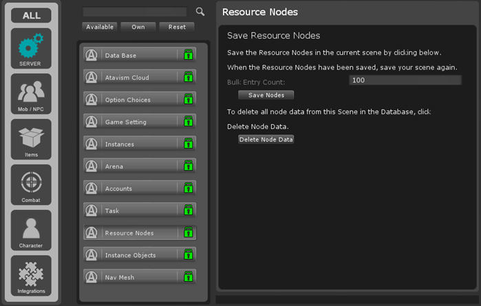 资源节点在Unity编辑器中设置,然后使用Atavism编辑器保存到内容数据库。