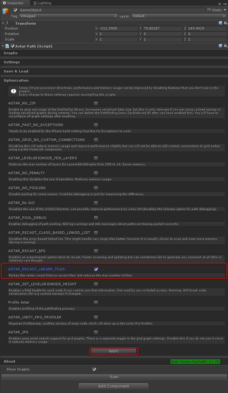 - Tick the ASTAR_RECAST_LARGER_TILES option and click Apply button